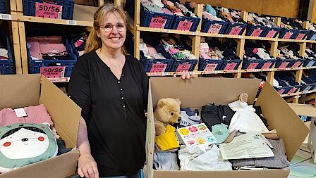 Babyspullen draait voornamelijk met vrijwilligers. Gelukkig zijn er daar genoeg van en Karin haalt veel voldoening uit haar werk. “Naast dat het mooi en dankbaar werk is om deze pakketten te maken, is het ook een heel gezellig team. Toen ik arbeidsongeschikt raakte en in contact kwam met deze organisatie werd dit voor mij een hele fijne dagbesteding waar ik veel voldoening uit haal.” Op de bovenverdieping van het magazijn worden de kleertjes en spullen in de juiste vakken en kratten gelegd, waarna het inpakken van de dozen kan beginnen. Er zit een duidelijk systeem in. Op de benedenverdieping komen de ingezamelde goederen binnen en wordt een eerste slag gedaan in het selecteren. “Niet alle kleertjes zijn geschikt. Soms zijn de kleertjes vies of kapot of dusdanig verwassen of gedragen, dat wij ze niet kunnen gebruiken. Die gaan dan weer naar het textielverwerkingsbedrijf. Kleding die niet in de pakketten kan maar wel kan worden gedragen, gaat naar Oost Europa.” Dat maakt de stichting ook duurzaam en circulair.